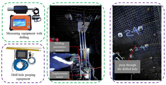 To further validate the intelligent recognition and prediction based on drilling parameters, this study conducted real-time drilling detection at the Dahaize coal mine’s transportation tunnel in Shaanxi. The current rock column diagram of the coal seam is depicted in Figure 13. The tunnel is excavated along the floor, with approximately 1 m of coal seam remaining at the roof. Above the coal seam lies a layer of muddy siltstone with low strength, and above that is a layer of fine-grained sandstone, which forms the main roof with higher strength. Within a 3 m range, the roof will exhibit at least three types of rock lithology changes, facilitating a clearer representation of changes in drilling signals relative to different drilling targets. During the construction of the roof anchoring holes, drilling parameter sensors were installed between the drill rig and the drill pipe to capture real-time values of thrust, torque, and Y-direction vibration. Displacement sensors were mounted on the rig’s base to measure changes in drilling displacement over time. The field experiment setup is shown in Figure 14.