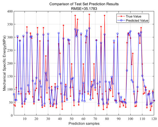 The previous LSTM model, which was used for classification prediction, proved inadequate for precise on-site engineering applications due to its lack of accuracy in intelligent prediction. To address this issue, it is essential to identify a value that represents the trend of changes in the drilling target’s characteristics. Due to the correlation between the mechanical specific energy of the drill bit and the uniaxial compressive strength of the rock mass, the mechanical specific energy can, to some extent, serve as a proxy for rock strength [32]. Thus, predictions of mechanical-specific energy during the drilling process can replace direct strength assessments of the drilled material. In this study, 300 data points were extracted to calculate the mechanical-specific energy of the drill bit during the ongoing drilling process. Out of these, 180 data points were designated as the training set, while 120 data points were used for testing. The thrust, torque, and Y-direction vibration were utilized as input features for regression predictions of the mechanical specific energy for each data point. Given that the LSTM model is less effective for predictions with limited data and exhibits lower accuracy for non-sequential data samples [33], this paper employs the random forest algorithm to predict mechanical specific energy during drilling. The predicted results are illustrated in Figure 16. Due to the complex field testing environment and the interference of various factors, the root mean square error (RMSE) of the mechanical-specific energy predictions was found to be 35.18, indicating some level of error in the numerical predictions. However, the algorithm demonstrated good performance in capturing the trends of mechanical-specific energy changes, particularly at lower values where identification accuracy was notably high. Therefore, it can be concluded that the random forest algorithm effectively utilizes drilling parameters to identify and predict lower-strength coal rock masses, thereby aiding in the recognition of roof deterioration areas.