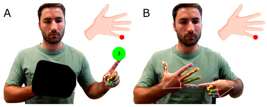 The visual display of the OpenPoint proprioception assessment, as implemented with a webcam. (A): The start position for the pointing task. Note that the image displayed to the participant is mirrored, so the user’s left hand appears on the left side of the screen. The assessment requires users to touch the fingertip of one hand with the fingertip of the other hand. The hand on the torso is the “target hand”, which is normally obscured using a graphically overlaid polygon, as shown on the left. (B): We removed the polygon to illustrate the accuracy of the finger tracking algorithm. The user is instructed to raise their pointing finger to a start target indicated by the green circle. The software then shows a target on the tip of one of the fingers of the cartoon hand (red circle). Following a three second countdown, the user is given an instruction to point and tries to touch the fingertip on their target hand, which is hidden by the polygon. Participants were instructed to refrain from directly looking at their own target hand. The tracking algorithm robustly tracks both fingertips and determines when the pointing finger stops moving, measuring the pointing error to assess proprioceptive ability.