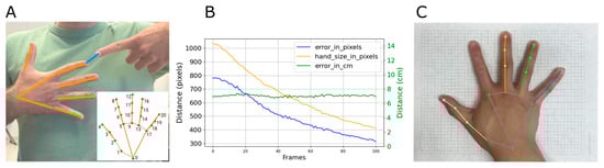 Pointing error calculation. (A) Example output from MediaPipe. The orange lines connect the landmarks returned by MediaPipe when the fingers are fully extended. We defined pointing error as the distance between the fingertips in the frontal plane (blue line). (B) Results from a simple experiment where the participants kept the distance between their fingers constant but moved their hands away from the camera by sliding backward on a rolling chair. The pixel-based pointing error (blue) decreased as the individual rolled back from the camera, as did apparent hand size, measured in pixels (orange line). The pixel-based pointing error (blue) has been multiplied by six to better show the decrease in distance. Dividing pixel-based pointing error by produced a constant pointing error (green) that can be scaled to centimeters based on the calibration photos in (C). (C) An example calibration photo of participant’s hand lying on top of graph paper in order to calculate .