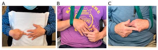 Examples of persons post stroke performing the pointing task. In Experiment 2, participants who had had a stroke sometimes could not extend the fingers of their target (hemiparetic) hand and were instructed to point to different landmarks on their hand depending on their capability. (A) Participant pointing to the fingertips while holding a foam pillow against the chest. (B) Participant pointing to the PIP joint while using an arm sling to hold his arm in a fixed position during the duration of the experiment. (C) Participant pointing to the MCP joint and using an arm sling.