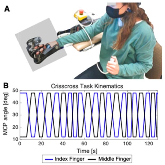 In order to test the concurrent validity of the OpenPoint assessment, we examined whether OpenPoint error correlated with finger proprioceptive error measured with a previously validated robotic proprioceptive assessment, the Crisscross assessment [27,28,44,60]. We implemented Crisscross with the FINGER robot (University of Idaho, Moscow, ID, USA), which uses two eight-bar mechanisms to independently move the index and middle finger. The Crisscross assessment used here comprised 20 finger-crossing movements, in which FINGER moved the index and middle fingers of the stroke-affected hand in opposing directions with the vision of the hand occluded. Participants were asked to indicate when the fingers crossed by pushing a button (Figure 5).