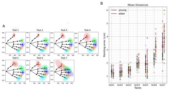Experiment 1 results. In this experiment we evaluated the pointing error of unimpaired young (n = 22) and older (n = 18) individuals in different tasks. (A) Two-dimensional representation of the target hand (in black) showing the mean and standard deviation across participants of the pointing endpoint (in colors). The plotted data are from the young group. (B) Pointing error for each task (black: mean and SD for younger participants, dark red: mean and SD for older participants). Colored points show the pointing error for individual users.