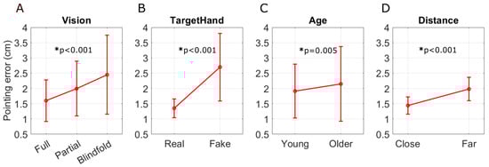 Pointing error as a function of different factors in Experiment 1. (A) Visual condition (ANOVA, p < 0.001). (B) Real or fake target hand (p < 0.001). (C) Age (p = 0.005). (D) Distance from the target hand to the body (p < 0.001). The error bars represent the standard deviation (SD) of the pointing errors.