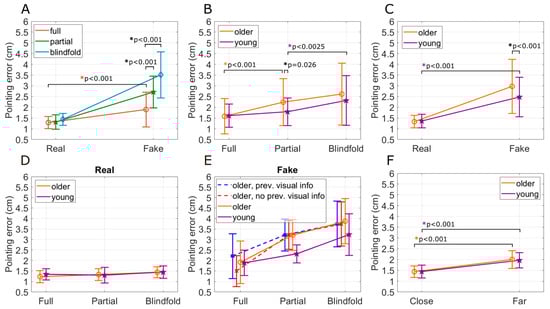 Further Analysis of Pointing Error from Experiment 1. (A) The effect of target hand conditions (real and fake) and visual condition (full, partial, and blindfolded), p < 0.001 (B) The effect of visual condition (full, partial, and blindfolded) and age (young and older), p = 0.05. (C) The effect of target hand (real and fake) and age (young and older), p = 0.002. (D) The effect of visual condition (full, partial, and blindfolded) and age (young and older) for the real hand, p = 0.59. (E) The effect of visual condition (full, partial, and blindfolded) and age (young and older) for the fake hand, p = 0.09, with additional lines showing the effects of task order. (F) The effect of distance (target hand close to the body vs. target hand extended out from the body) and age (older and young), p < 0.001. The error bars represent the standard deviation (SD) of the pointing errors.
