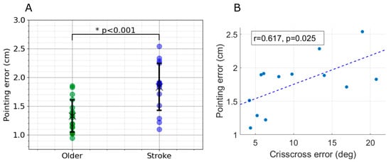 Results from Experiment 2. Proprioceptive pointing error was higher in persons who had experienced a stroke and was correlated with an independent, robot-based measure of their finger proprioception. (A) The pointing errors from Task 2 comparing the older and stroke groups. The stroke group had a significantly larger pointing error compared to the older group (p < 0.001). The error bars represent the standard deviation (SD) of the pointing errors. (B) OpenPoint pointing error was moderately correlated with the Crisscross finger proprioception error angular error. Each scatter point represents a participant.