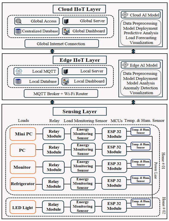 The proposed Industrial Internet of Things (IIoT) infrastructure consists of three essential parts: the sensing layer, the edge layer, and the cloud layer. The architecture of this system is illustrated in Figure 1, which depicts these three layers. In the sensing layer of the IIoT system, sensors and microcontrollers like the (Espressif Systems) ESP32 with temperature- and energy-monitoring (PZEM 004T) sensors gather real-time data from diverse industrial loads, including a mini PC, PC, refrigerator, and LED light. The data collected by the sensing layer are transmitted to the edge IIoT layer, where a local message queuing telemetry transport (MQTT) broker, a local server, and a local database handle real-time data processing and storage. This layer handles real-time data preprocessing, analyzes the edge AI model for anomaly detection, and visualizes any detected anomalies in the local dashboard. It ensures low-latency, highly reliable, lightweight, and secure data communication by utilizing MQTT brokers with the MQTT protocol over the wireless fidelity (Wi-Fi) routers. Finally, the edge IIoT Layer connects with the cloud IIoT layer or the centralized IIoT layer, which features a centralized database, global server, and dashboard for comprehensive data visualization and global access. This layer facilitates data preprocessing, AI model deployment, predictive analysis, and load forecasting, all supported by a global internet connection that ensures reliable and uninterrupted remote access to the cloud.