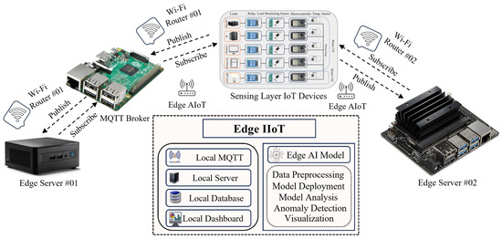 Figure 2 illustrates a sophisticated layout for an edge-computing architecture designed to integrate IIoT with Artificial intelligence of things (AIoT) capabilities. It incorporates multiple interconnected components to facilitate real-time data processing, anomaly detection, and intelligent decision-making. At the core of this system are two edge servers, Edge Server 01 and Edge Server 02, which are connected through Wi-Fi routers (Router 01 and Router 02) and communicate using the MQTT protocol. These edge servers perform local data processing and host edge AI models for tasks such as data preprocessing, model deployment, model analysis, anomaly detection, and visualization.