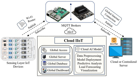 A global internet connection is used to transfer data from the MQTT brokers to centralized IIoT, enabling uninterrupted communication with the cloud IIoT or centralized IIoT platform. The cloud IIoT platform comprises several key components—Global Access, Global Server, Global Database, and Global Dashboard—all of which are installed on a centralized server PC. These components ensure worldwide data access, secure data storage, and a user-friendly interface for monitoring and management. Furthermore, the cloud AI model, an integral part of the cloud IIoT, is responsible for advanced data processing tasks such as preprocessing, model deployment, predictive analysis, load forecasting, and visualization. The process involves fetching data from the MariaDB database, followed by preprocessing to prepare the data for analysis. Next, a load forecasting AI model is trained using these preprocessed data. Once the model is successfully trained, it is deployed for use, and finally, it generates forecasts to predict load demand. The data flow is bidirectional, with the cloud infrastructure capable of sending commands or data back to the MQTT brokers, which in turn, can communicate with the sensing layer devices. This closed-loop communication ensures real-time monitoring and control of the IoT devices, enabling efficient management of industrial processes. Additionally, ZeroTier is employed to securely [60] access the centralized IIoT or cloud IIoT server by creating a virtual network that ensures encrypted communication between remote devices and the server. This virtual network allows devices to connect directly to the cloud IIoT server over the global internet, bypassing the potential security risks associated with traditional network setups. By using ZeroTier’s secure peer-to-peer architecture, we can facilitate smooth and reliable access to the IIoT platform for efficient real-time monitoring and data management.