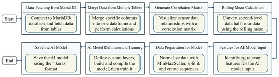 Figure 4 presents a detailed workflow for developing an AI model using sensor data, organized into several critical stages. It begins with data fetching from MariaDB, where data are extracted from a database to form the foundation for analysis. Next, in the process of merging data from multiple tables, specific columns are combined into a single dataframe. This ensures comprehensive calculations, such as computing the total power consumption. The workflow progresses to generate a correlation matrix, visualizing sensor data relationships in order to identify significant correlations for feature selection and model accuracy.