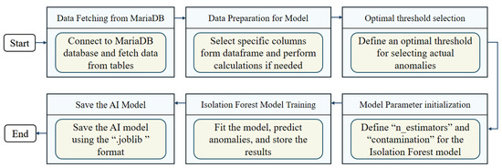 Figure 5 depicts a structured workflow for developing an AI model aimed at detecting anomalies, particularly using the isolation forest model. The process begins with data fetching from MariaDB, which involves connecting to a MariaDB database to retrieve essential data from various tables. This initial step is fundamental, as it provides the raw data required for the entire analysis. Following data acquisition, the data preparation for the model stage involves selecting specific columns from the dataframe and performing any necessary calculations. This step ensures that the data are in the correct format and that they contain all the relevant information needed for anomaly detection. Next, in the optimal threshold selection phase, an optimal threshold is defined for selecting actual anomalies. This is a critical step, as it determines the sensitivity of the model in detecting anomalies, balancing the trade-off between false positives and false negatives. To optimize the isolation forest model for anomaly detection under transient conditions of electrical appliances, we performed a hyperparameter tuning process by using grid search.