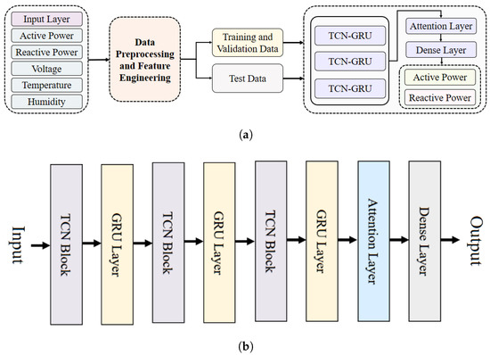 Figure 6a depicts the overall model architecture, while Figure 6b presents the arrangement of the TCN and GRU layers along with an attention mechanism and a dense layer. This model presents a novel approach by simultaneously forecasting both active and reactive power loads, which is crucial for modern energy distribution and management systems. This capability addresses a significant gap in existing technologies, which often only concentrate on active power forecasting and overlook the critical role of reactive power in grid stability and energy efficiency.