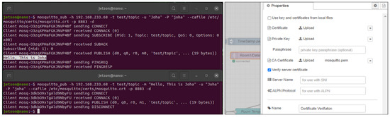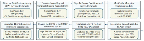 The security process for the MQTT broker begins with configuring Mosquitto to use username and password authentication. Using the Mosquitto password file utility, a password file is created for users, ensuring that only authenticated clients can connect. The Mosquitto configuration file is then modified to reference this password file and to disable anonymous connections, enhancing the security of the broker. Figure 9 outlines a comprehensive process for securing an MQTT broker using TLS/SSL, connecting it to the Node-RED dashboard, and integrating it with an ESP32 device. The process starts with generating a certificate authority (CA) key and certificate, followed by creating a server key and certificate signing request (CSR). The server certificate is then signed with the CA certificate, ensuring trusted communication. The Mosquitto configuration file is modified to enable TLS/SSL, referencing the necessary certificates and keys. The certificate is converted to PEM format for compatibility, and the MQTT node in Node-RED is configured to use this secured connection. The final steps involve configuring the ESP32 to connect to the MQTT broker using the CA certificate for TLS/SSL encryption, ensuring secure data transmission. By setting the CA certificate in the ESP32 code (espClient.setCACert(ca_cert)), a secure, encrypted connection is established. This setup guarantees that all data transmitted between the ESP32, MQTT broker, and Node-RED dashboard are encrypted, maintaining data integrity and confidentiality. This process ensures robust security for IIoT applications by protecting against unauthorized access and data breaches.