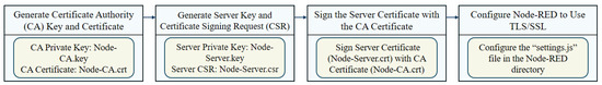To secure the Node-RED server, it is crucial to generate TLS/SSL certificates using OpenSSL to enable Hypertext Transfer Protocol Secure (HTTPS), ensuring encrypted communication. The process illustrated in Figure 10, which involves setting up a self-signed certificate authority (CA) and server certificates on a local machine, is somewhat complex, but it is essential for securing the Node-RED server. Initially, the CA’s private key and certificate are created using OpenSSL commands. Subsequently, a private key and a certificate signing request (CSR) for the server are generated. This CSR is then signed with the CA certificate to produce the server certificate. Finally, adjustments are made in the settings.js file of Node-RED to enable HTTPS, incorporating the newly created certificates. By following this process, enhanced security through encrypted communication is achieved for the Node-RED server. Additionally, a bcrypt hash for the desired password is generated, and the settings.js file is updated to include adminAuth settings, specifying the username and hashed password. The changes are saved, and Node-RED is restarted to apply the new configurations. Finally, the setup is verified by accessing the Node-RED dashboard via HTTPS protocol and logging in with the configured credentials.