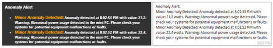 In deploying real-time anomaly detection in the edge servers, we faced several challenges. The first challenge was the need for efficient data handling, as the model fetches data every second from multiple sources and processes it in real-time to check for anomalies. To address this, we implemented local data preprocessing and utilized MQTT for efficient data transmission, which significantly reduced communication delays between the sensors and the edge servers. Another challenge was providing real-time visualization of anomalies for the user. Once anomalies were detected and stored in MariaDB, we configured Node-RED to display this data on a dashboard, enabling users to track anomaly trends instantly and enhancing the system’s usability and reliability. Finally, we faced the challenge of alerting users promptly when anomalies were detected. To solve this, we implemented a notification system where, upon anomaly detection, a message was sent to the user’s smartphone via the Telegram application, in addition to a visual notification on the Node-RED dashboard. This ensures that users are alerted instantly, both visually and via mobile notifications, improving system responsiveness.