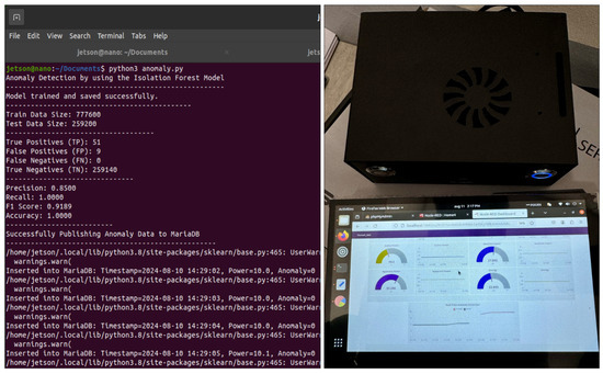 Figure 24 illustrates an edge IIoT environment implemented on a Jetson Nano board, featuring an AI model for anomaly detection, MQTT for data communication, a MariaDB database for data storage, and a Node-RED dashboard for real-time visualization. This setup is for Edge Server 02 (Home 02), which monitors and controls an LED light, with the Jetson Nano board implemented as the edge computing device. However, additional appliances can easily be integrated into the system in Home 02. On the left, where the anomaly detection AI model is implemented on the Jetson Nano board, the terminal output indicates the successful training of an isolation forest anomaly detection model, which achieved a precision of 0.8500, recall of 1.0000, F1 score of 0.9189, and perfect accuracy of 1.0000 in identifying anomalies. The model’s results are published in the MariaDB database, with timestamps, actual power values, and detected anomalies. On the right side, the setup displays the Jetson Nano board running a Node-RED dashboard, connected to a screen, and displaying real-time power metrics and anomaly detection results. This setup highlights the Jetson Nano’s ability to manage AI processing, data communication, managing a database, and visualization simultaneously in an industrial or residential edge computing environment. To ensure efficient data transmission, we implemented the MQTT protocol, which significantly reduces communication delays between the sensors and the edge servers. The anomaly detection model operates continuously, as shown in Figure 24, fetching high-frequency sensor data every second to identify potential anomalies, ensuring timely detection and quick system response. Additionally, the system latency from the Python script to the data being sent to the database is approximately 5 milliseconds (0.005 s), ensuring minimal delay in processing and real-time monitoring.