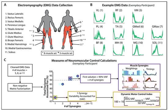 (A) EMG data were collected from 11 different muscles. Reduced muscle sets of 8 and 5 muscles were selected for continuity with prior research; (B) Exemplary EMG data from the 11 different muscles for one participant; (C) Dynamic motor control index and muscle synergy calculations for an exemplary participant. EMG data from 5, 8, or 11 muscles were inputted into a non-negative matrix factorization algorithm. This algorithm calculates the best solution for 1 synergy up to (#muscles—1) synergies and reports the solution’s variability accounted for (VAF). The 1-synergy solution is used to calculate the dynamic motor control index. The first solution with >90% of the VAF (or until a new synergy does not increase VAF by at least 5%) is the muscle synergy solution.