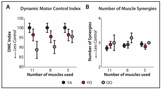 Two individuals were excluded from the analysis for reasons previously described [39], resulting in 36 total participants in the analysis. On average, the young subgroup (N = 18 participants; 11 female) was 27 ± 3 years old, the young-old subgroup (N = 13 participants; 10 female) was 70 ± 3 years old, and the old-old subgroup (N = 5 participants; 3 female) was 78 ± 2 years old. By definition, the dynamic motor control index for the young group was 100 ± 10 for all three muscle sets. For the young-old group, the dynamic motor control indices were 96.4 ± 10.79 for the eleven-muscle set, 95.49 ± 10.82 for the eight-muscle set, and 96.40 ± 10.69 for the five-muscle set. For the old-old group, the dynamic motor control indices were 88.86 ± 9.67, 90.35 ± 7.31, and 95.52 ± 6.74 for the eleven-, eight-, and five-muscle sets, respectively (Figure 2). The number of muscle synergies for each muscle set for each subgroup is reported in Table A1.