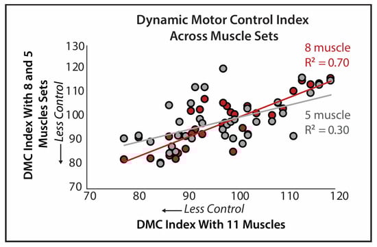 Dynamic motor control indices of the 8-muscle set are highly correlated with the 11-muscle set (R2 = 0.70), while the 5-muscle set is not (R2 = 0.30).