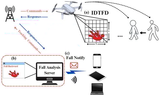 The overview diagram of dynamic tracking and fall detection using a drone. (a) Intelligent dynamic tracking and fall detection system. (b) Fall analsis server. (c) Fall notify.
