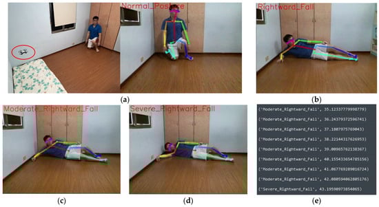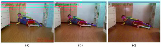 Moreover, by adjusting the weights assigned to these feature values in the feedback of the fall classification model, this study effectively reduces the loss function value and further enhances the model’s accuracy in recognizing fall postures in different directions. Ultimately, this system enables the drone to detect four different fall directions and notify pre-designated family members and healthcare professionals through the fall care module. The four specific fall postures are illustrated in Figure 6a–d below:
