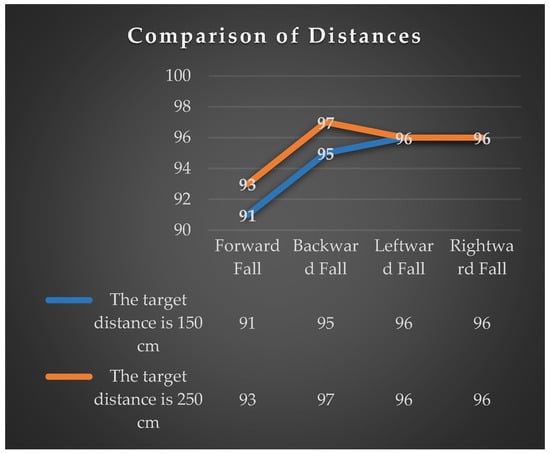 The intelligent tracking and fall detection algorithm of this study was compared with Google Teachable Machine’s Pose Project training model, as shown in Figure 12 and Figure 13. In both similar and dissimilar background conditions, the accuracy of the intelligent tracking and fall detection algorithm for detecting and recognizing the four directions of fall posture was higher than that of the Google Teachable Machine. Particularly, the accuracy of identifying the backward fall posture saw the greatest improvement, with recognition accuracy increasing from 70.35% to 95% in similar background conditions and from 65.9% to 95% in dissimilar background conditions.