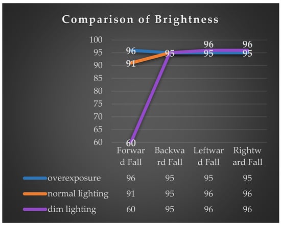 In this experiment, based on the previous experiments conducted in different lighting conditions for four types of fall directions, we observed that in dim lighting conditions, the forward fall was affected by shadowing on the head, resulting in key point loss above the neck by OpenPose and subsequently leading to a recognition rate of only 60%. Therefore, we tested whether adjusting the brightness through the normalization function (NORM_MINMAX) in OpenCV could improve the recognition rate of forward falls in dim lighting conditions. The experimental results are shown in Table 2 below.