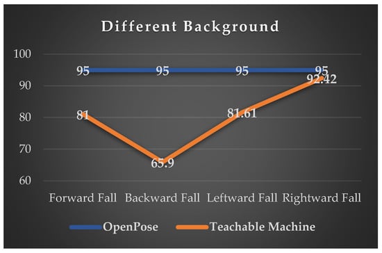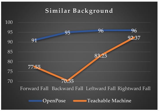 In both similar and dissimilar background scenarios, the recognition accuracy of the four fall directions detected by the fall detection system developed based on OpenPose in this study, compared to the Pose Project training model of the Google Teachable Machine system, is generally above 92%, except for the rightward fall direction which exhibits similar recognition accuracy. However, for the other three fall directions, the recognition accuracy is slightly lower compared to that of the system developed in this study. The main reason lies in the similarity between the Teachable Machine system and OpenPose detection methods, facilitated by the Pose Project training model, making it less susceptible to changes in surrounding backgrounds, hence resulting in fewer recognition failures. Nonetheless, experimental results indicate that while the Teachable Machine is capable of recognizing fall postures, it tends to confuse directional falls, leading to instances where a subject displaying a forward fall posture might be incorrectly identified as leftward, rightward, or backward falls. Additionally, among the four fall postures, the recognition accuracy for rear falls is the lowest. This can be attributed to the inability of the Teachable Machine to detect facial key points in certain rear fall postures, resulting in misidentification as one of the other three fall directions.