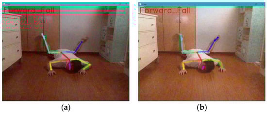 The module identifies human postures based on the OpenPose model. OpenPose uses a CNN deep learning architecture to generate confidence maps for each joint position of the human body, and the Part Affinity Field (PAF) defined by OpenPose annotates the 2D vectors of each limb in the body. By integrating these two features, OpenPose can further predict each limb segment and successfully outline the entire body skeleton, consisting of 25 key points, as shown in Figure 5a. This study uses OpenPose to obtain the x and y coordinates of each joint point in the image. The fall classification model developed in this study then identifies whether the user is in a fall posture, allowing the drone to immediately notify the care recipient of the fall. Additionally, this function enables the host device to display the name of the fall posture, as shown in Figure 5b.