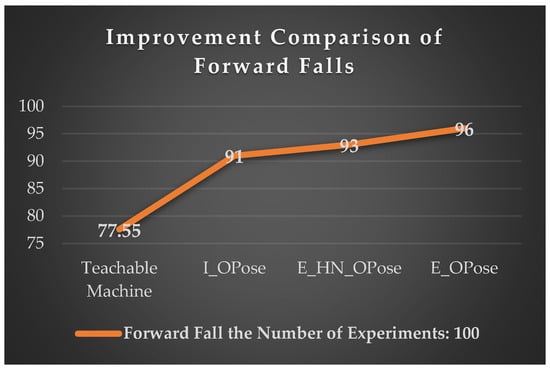 In this experiment, we first improved the detection of forward falls by modifying the I_OPose method, which detects the height difference between the neck and nose, and replaced it with the E_HN_OPose method, which detects the height difference between the waist and neck. This change led to an increase in forward fall recognition accuracy to 93%. The main reason for this improvement is that the drone’s view of the back is less affected by shadows, allowing OpenPose to more clearly identify key points of the posture during forward fall detection.