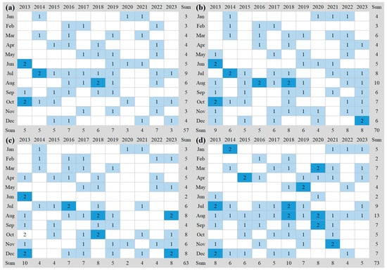 Sampling frequency of Landsat 8 OLI imagery covering the (a) Xiaojiang, (b) Caotang, (c) Daning, and (d) Xiangxi Rivers. The numbers 1 and 2 on the light and dark blue backgrounds respectively represent the number of satellite imagery available in the corresponding month. Blank indicates missing data.