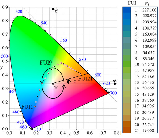 The 21 levels of FUIs and their hue angles αt in CIE-xy chromaticity system.