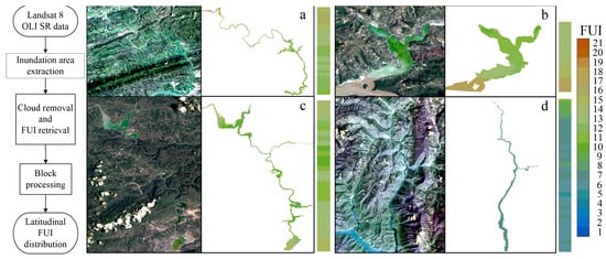 Through the framework shown in Figure 4, latitudinal FUI distribution in the TGR tributaries can be extracted from the Landsat 8 OLI SR data batch processed on the GEE platform. Specifically, moderate latitudinal blocking, installed on the Xiaojiang, Daning, and Xiangxi Rivers with 30 pixels and Caotang River with 5 pixels, is applied for computational efficiency and result validity. Thus, the time series of latitudinal FUI distribution in the four typical TGR tributaries have been constructed by mean computation and chromaticity mapping (Figure 5).
