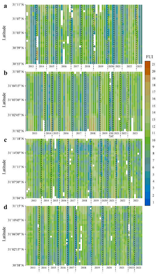 Time series of latitudinal FUI distributions in the (a) Xiaojiang, (b) Caotang, (c) Daning, and (d) Xiangxi Rivers. Blank indicates missing data due to cloud removal processing.