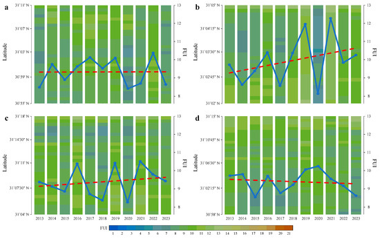 Latitudinal distribution of yearly mean FUIs in the (a) Xiaojiang, (b) Caotang, (c) Daning, and (d) Xiangxi Rivers. The blue line is connecting the yearly mean FUIs, and the red dashed line denotes the yearly FUI trend.