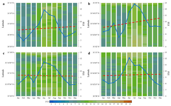 Latitudinal distribution of monthly mean FUIs in the (a) Xiaojiang, (b) Caotang, (c) Daning, and (d) Xiangxi Rivers. The blue line is connecting the monthly mean FUIs, and the red dashed line denotes the monthly FUI trend.