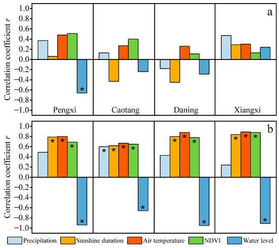 Figure 8b exhibits the causal correlation between monthly mean FUIs and natural/anthropogenic drivers. Hence, advances in sunshine duration, air temperature, or NDVI could potentially transform the monthly FUI trends into an accelerated greening in the Xiaojiang, Daning, and Xiangxi Rivers or even yellowing in the Caotang River due to the strong positive relationship (r ≥ 0.6) and statistical significance (p < 0.05). It is worth noting that the water level appears to have the closest correlation with the FUI (p < 0.05 and |r| ≥ 0.6), indicating that the responses of monthly FUI trends in the four tributaries to the storage and discharge of the TGR are statistically significant.