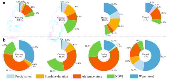 Furthermore, a quantitative analysis of the relative contributions of natural and anthropogenic drivers to the synergistic effect on the temporal characteristics of FUI shift must be considered. Overall, the total contribution of precipitation, sunshine duration, air temperature, NDVI, and water level on the FUI trend ranges between 21.8% and 48.8% as well as between 68.8% and 97%, with a mean value of 36.2% and 88.8%, on the yearly and monthly scales, respectively (Figure 9), indicating the strong temporal heterogeneity in the driver contribution of FUI trend across the TGR.