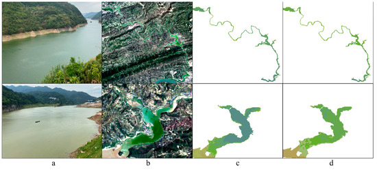 Comparative examples of (a) field photograph, (b) Landsat-derived true color imagery, Landsat-derived FUIs based on (c) RGB and (d) interpolation models for the water colors in the Xiaojiang (upper) and Caotang (below) Rivers on 18 May 2023.