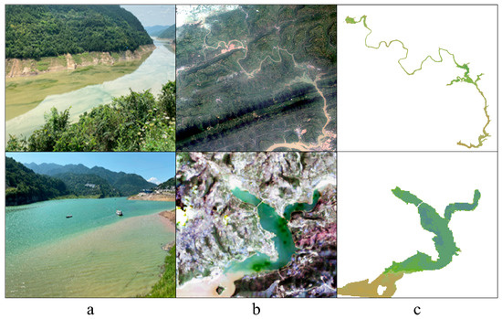 Examples of unique water color phenomenon, i.e., coexistence of phytoplankton bloom and summer flood, in the Xiaojiang (upper) and Caotang (below) Rivers based on (a) field photograph, (b) Landsat-derived true color imagery, and (c) Landsat-derived FUI on 4 June 2021.