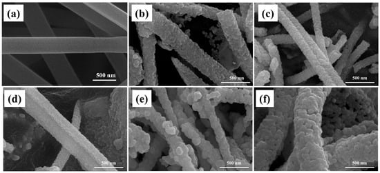 Figure 1a shows SEM morphology of pristine ZnO NFs before annealing. As shown, the surface is quite smooth, with a diameter of approximately 400 nm. However, after annealing, due to the evaporation of organic species, the surface becomes rough and the diameter decreases slightly (Figure 1b). It should be noted that the final diameter of NFs depends on various parameters such as applied voltage, the distance from the nozzle to the collector, the annealing temperature, and so on. Figure 1b–f show FE-SEM views of the ZnO-NiO composite NFs with different NiO contents after annealing. Their surfaces are rough, and their diameters are ~150–300 nm. Due to the evaporation of the solvent and the organic species during annealing, the surfaces of the NFs were rough and contained ultrafine grains. Overall, all samples had very similar morphologies since they were synthesized using the same procedure.