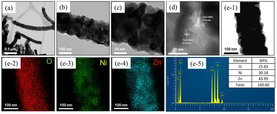 (a–c) TEM (d) HRTEM image (e-1–e-5) EDS analysis of ZnO-NiO (40 wt%) composite NFs.