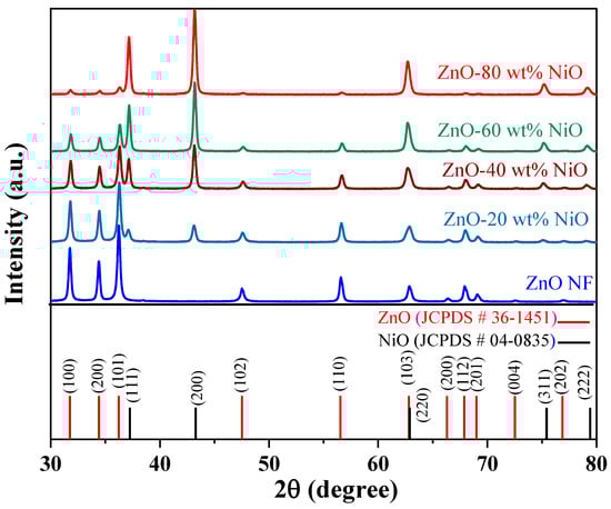 Figure 3 shows the XRD patterns of pristine ZnO and ZnO-NiO composite NFs with various NiO content. For pristine ZnO NFs, all diffraction peaks were related to the crystal planes of hexagonal wurtzite ZnO (JCPDS No. 36-1451). For composite NFs, new peaks appeared at Bragg angles of 37.18°, 43.1°, 62.88°, 75.24°, and 79.23°, and they corresponded to the (111), (200), (220), (311), and (222) crystal planes of the cubic phase of NiO (JCPDS No. 73-1523). Since the NiO content in composite NFs rose, the intensity of NiO peaks increased gradually, reflecting the higher amount of NiO. The co-existence of NiO and ZnO phases is beneficial for sensing applications as they form p–n heterojunctions [29,30].