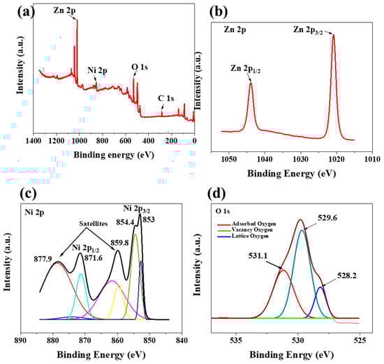 Figure 4a depicts the XPS survey of ZnO-NiO (40 wt%) composite NFs, and peaks related to the Zn, Ni, O, and C (from the surrounding environment) can be observed. Notably, there are no peaks related to impurity elements. To obtain more insights, we examined the XPS core-level regions of different elements. Figure 4b displays the Zn 2p core-level region; similar to pristine ZnO, two peaks can be seen that are centered at 1021.5 and 1044.5 eV. These are related to Zn 2p3/2 and Zn2p1/2, respectively and they are connected to the existence of Zn2+ in ZnO [14,29]. The Ni 2p core-level region comprising five peaks is displayed in Figure 4c. The peaks at 853, 854.4, and 859.8 eV are assigned to Ni 2p3/2 and its satellite peak, and the two peaks at 871.6 and 877.9 eV are attributed to Ni 2p1/2 and its satellite peak [31]. In the Ni 2p3/2 region, the peak at 853 eV can be ascribed to Ni2+ ions, while that at 854.4 is related to Ni3+ ions. The two shake-up satellite peaks at 859.8 and 877.9 eV are indicative of NiO [32,33]. The O 1s core-level region was deconvoluted into three peaks at 528.2, 529.7, and 531.2 eV. These belonged to lattice oxygen, oxygen vacancy defects, and adsorbed oxygen species, respectively (Figure 4d) [29,34].