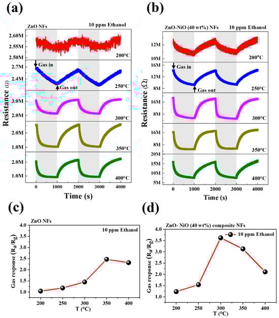 Figure 5a,b show the sensing curves of pristine ZnO and ZnO-NiO (40 wt%) composite NF sensors for 10 ppm ethanol gas at various temperatures, respectively. Both sensors exhibited n-type characteristics at all temperatures because the ZnO phase was dominant in them. For better comprehension, in Figure 5c,d, the response values of both pristine ZnO and ZnO-NiO (40 wt%) composite NFs gas sensors are plotted against the sensing temperature for 10 ppm ethanol gas, respectively. At every temperature, the composite sensor indicated a greater response compared to the pristine sensor. In particular, the optimal sensing temperature for the composite sensor was 300 °C. It was higher for the pristine sensor, standing at 350 °C; this showed the potential of composites to reduce the sensing temperature, similar to what was seen in a previous study [35].
