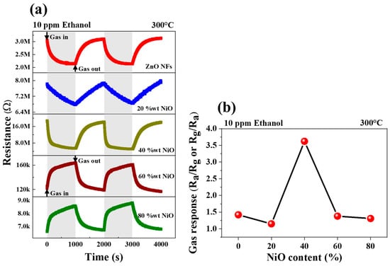 (a) Dynamic resistance plots of the ZnO-NiO composite NFs sensors with varying NiO contents (0–80 wt%) for 10 ppm ethanol gas at 300 °C. (b) The response of the composite gas sensors to 10 ppm ethanol versus NiO content.