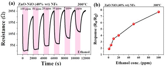On acidic oxide surfaces, ethanol is first dehydrated to ethylene (C2H4), while on basic oxide surfaces, ethanol is dehydrogenated to acetaldehyde (CH3CHO). The intermediate products are further oxidized to H2O and CO2 [41]. Since ethylene has higher stability than acetaldehyde, ethanol sensing is promoted on surfaces of basic oxides such as ZnO [42]. Thus, in ZnO-NiO with 40 wt% NiO, owing to the higher amount of ZnO relative to composites with higher NiO content, stronger interactions are expected between the sensor and ethanol gas, resulting in higher sensing for ethanol. Finally, owing to their one-dimensional (1D) morphologies, the synthesized composite NFs provided abundant adsorption sites for ethanol gas molecules. However, the contribution of the 1D morphology to the sensing properties would have been the same for all gas sensors since they were all synthesized under the same conditions.