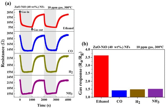 (a) Dynamic resistance plots of the ZnO-NiO composite NF sensor with 40 wt% NiO for a concentration of 10 ppm of different gasses at 300 °C and (b) the corresponding selectivity plot.