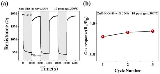 (a) Long-term stability (after six months) and repeatability (during three cycles) of ZnO-NiO (40 wt.%) NFs sensor to 10 ppm ethanol gas at 300 °C. (b) Variations in sensor response during three sequential cycles.