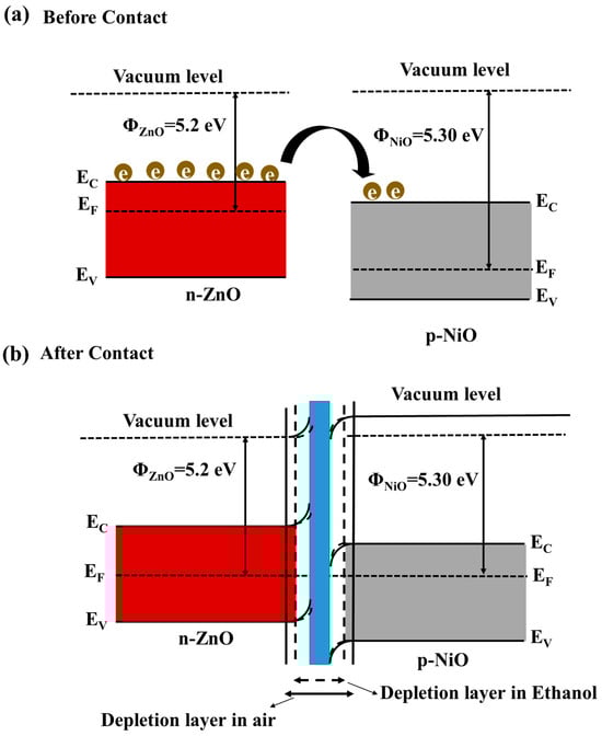 Band energy levels of ZnO and NiO (a) before and (b) after contact in air and ethanol.
